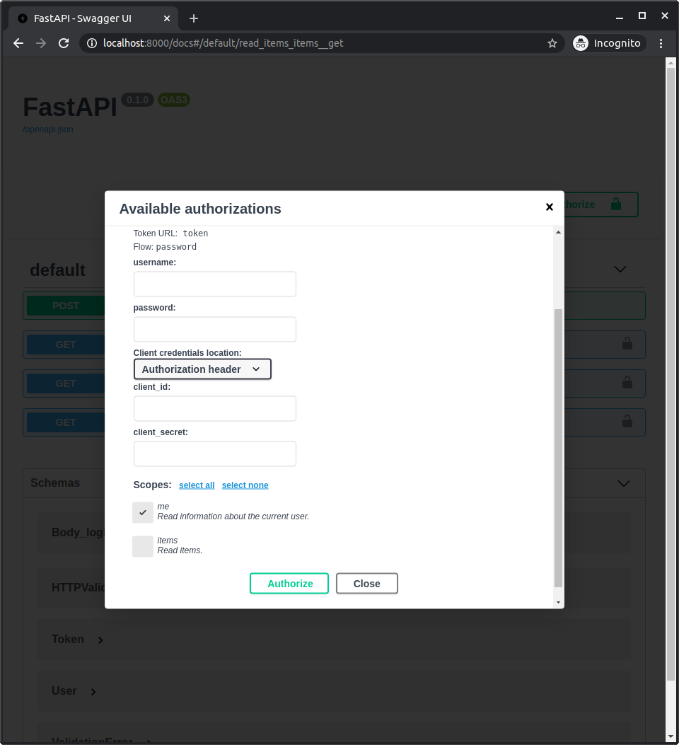 scopes={"me": "Read information about the current user.", "items": "Read items."},
